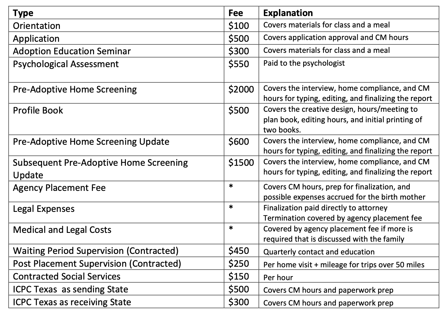 The agency placement fee is paid to AdoptionWorks for the case management of the adoption triad. The following expenses are covered under the agency placement fee. It should be noted that the agency placement fee is not due until the placement of a child occurs. Therefore, the agency may be responsible for covering allowable expenses for an expectant mother that does not choose to place her child or continue with a modern adoption plan.